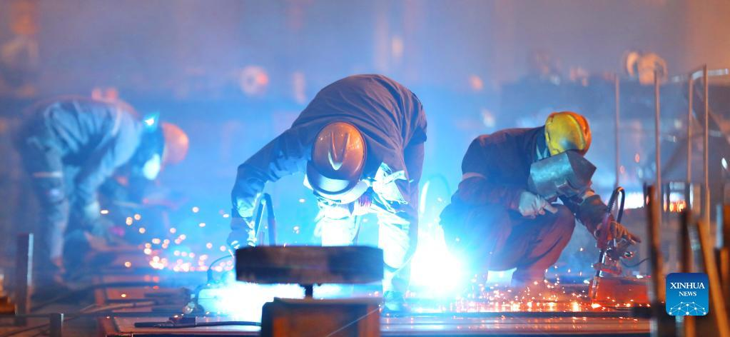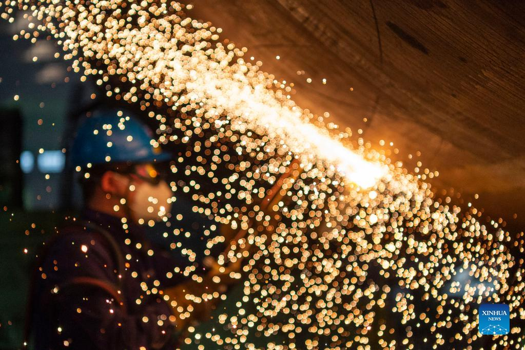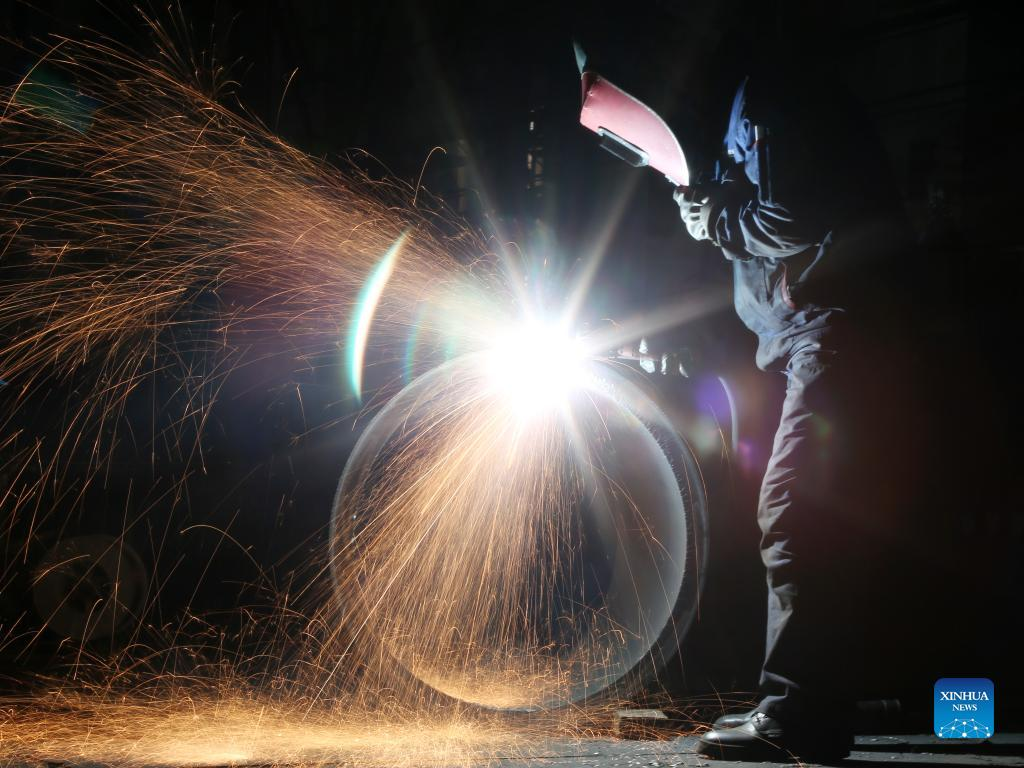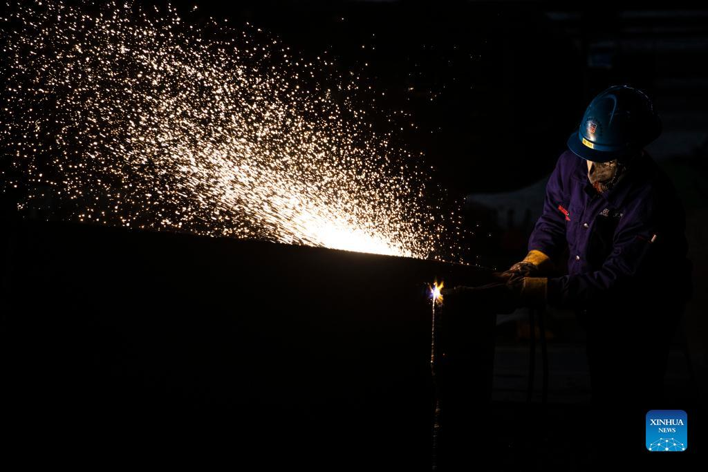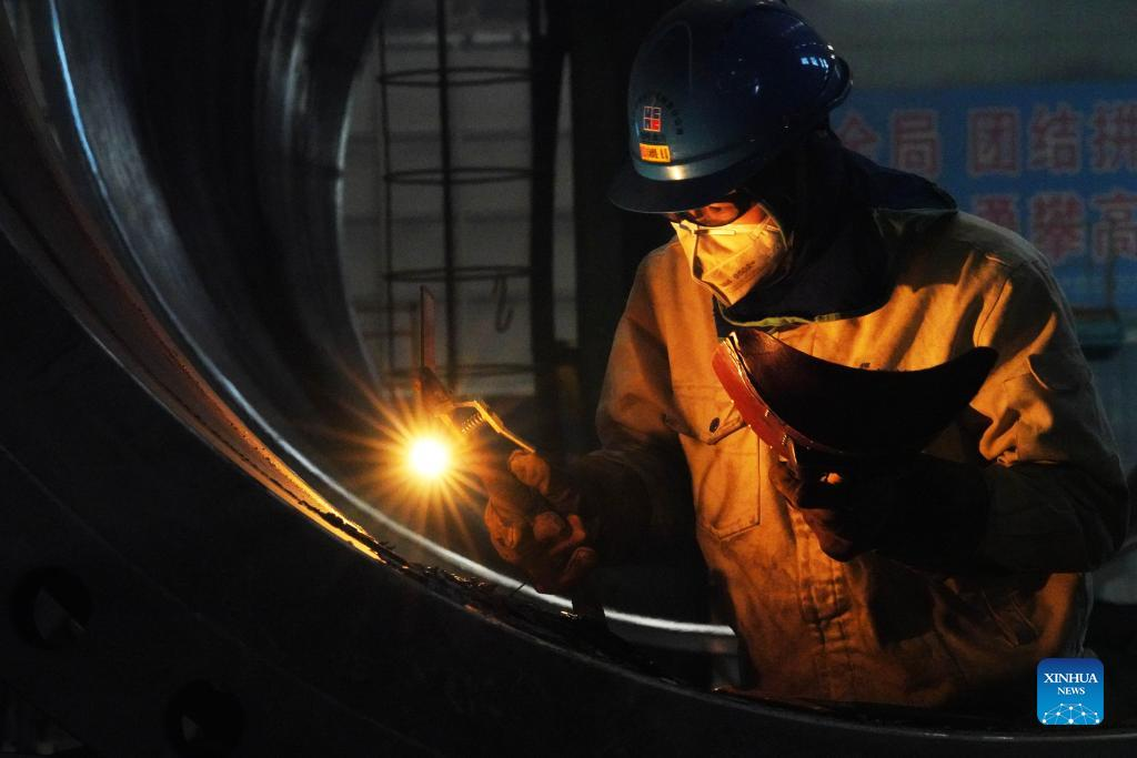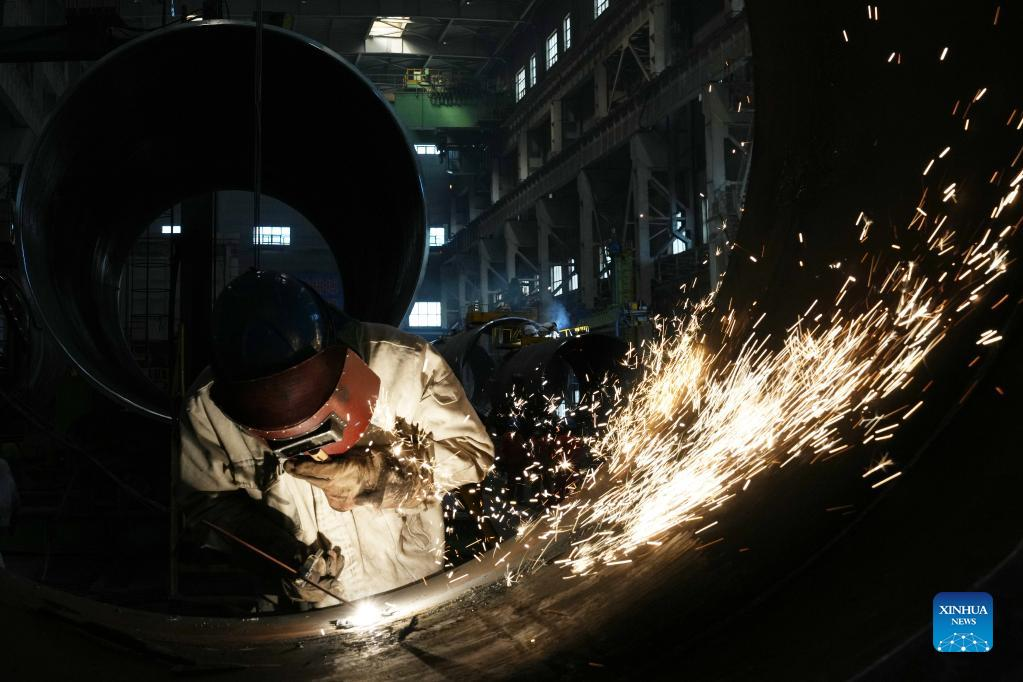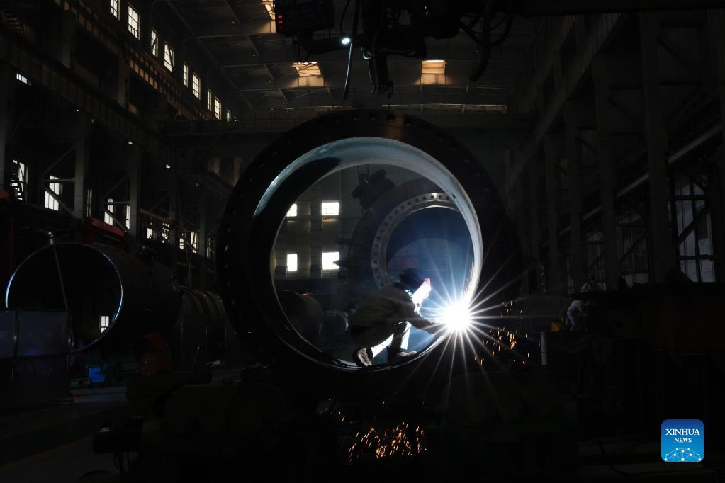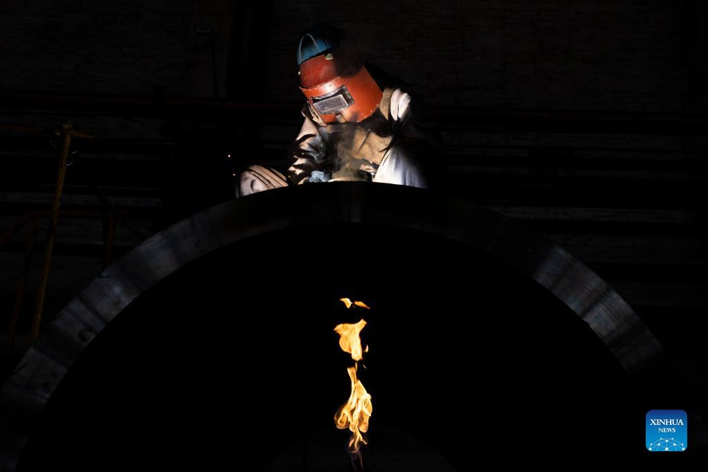 Workers are busy at Harbin Boiler Company Ltd. of Harbin Electric Corporation in Harbin, northeast China's Heilongjiang Province, April 14, 2022. International Workers' Day, also known as May Day, is observed on May 1 in China. The group of photos uses the light and shadow in photography to outline the labor scene of the industrial workers in China's Heilongjiang Province. (Xinhua/Wang Jianwei)