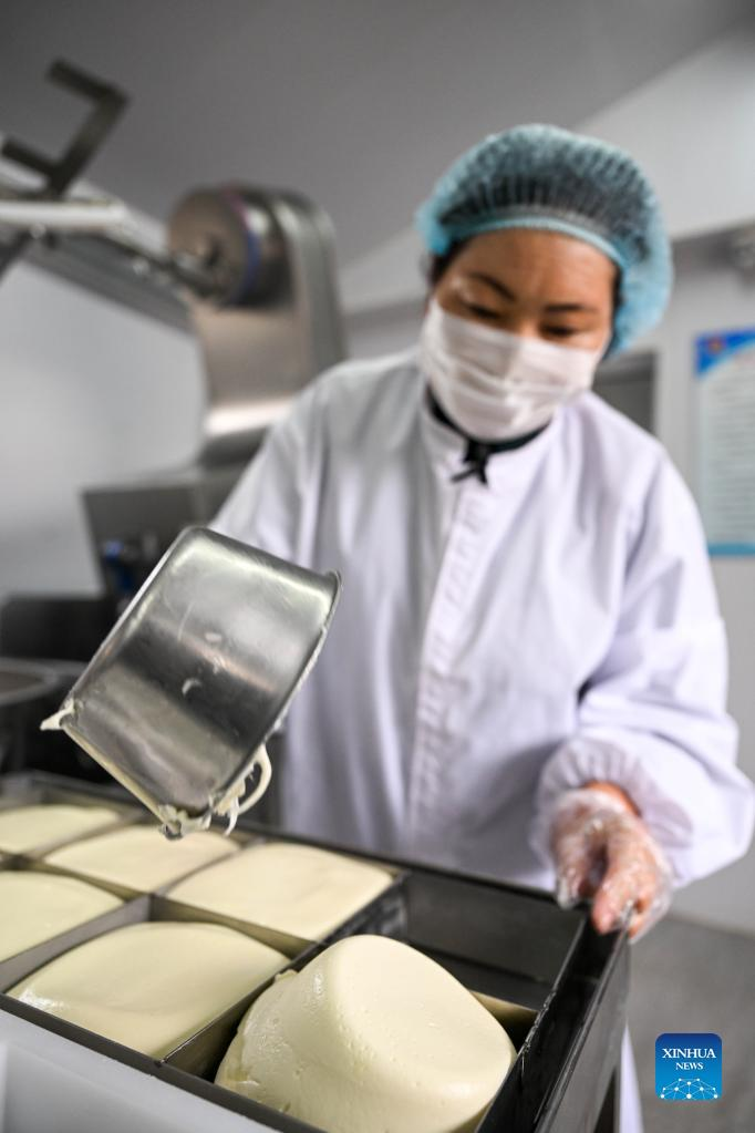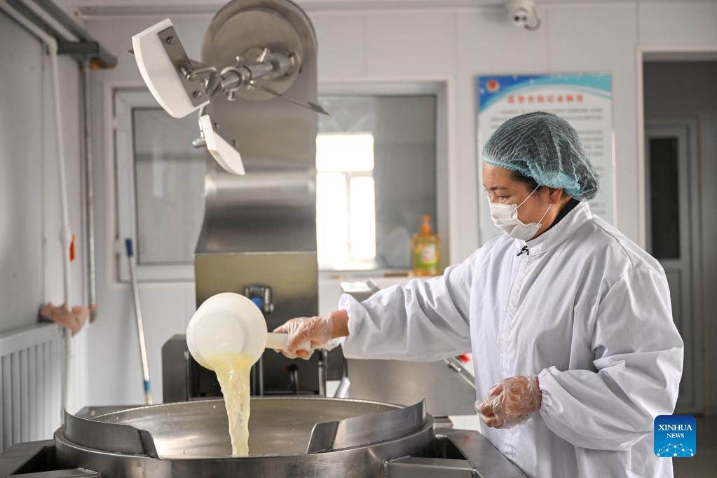 Tao Gao makes dairy product at her workshop in Zhenglan Banner of Xilingol League, north China's Inner Mongolia Autonomous Region, April 27, 2022. Tao Gao is the national intangible inheritor of Chagaanyidee (dairy product) in Inner Mongolia. She combines modern techniques with traditional crafts and trains herders in pastoral areas to make dairy products. In recent years, the local government has boosted the development of traditional dairy food industry to increase the income of herdsmen. The average annual sales of dairy food in the whole banner reached about 60 million yuan (about 9 million U.S. dollars) in the past two years. (Xinhua/Lian Zhen)