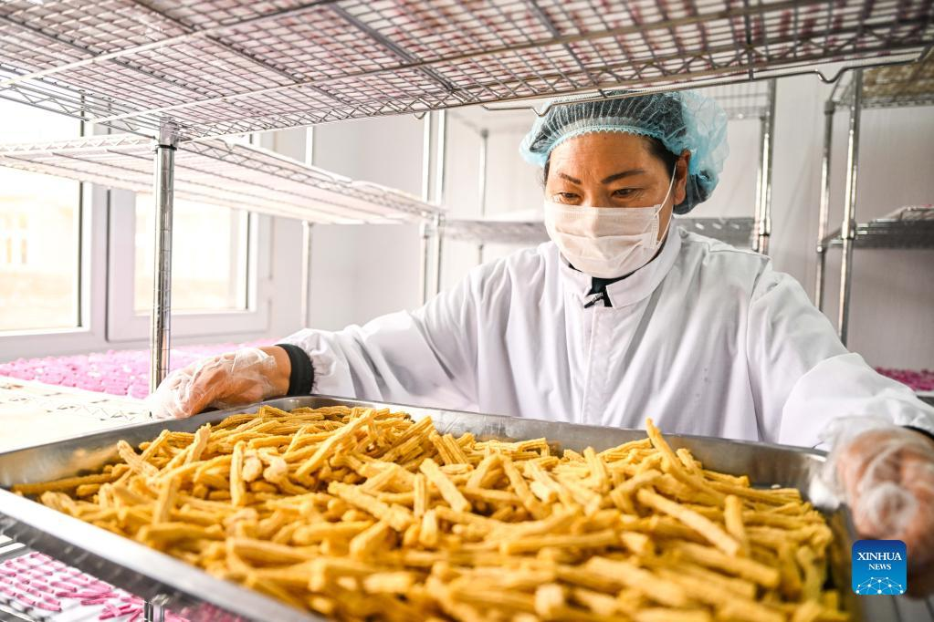 Tao Gao dries a new dairy product at her workshop in Zhenglan Banner of Xilingol League, north China's Inner Mongolia Autonomous Region, April 27, 2022. Tao Gao is the national intangible inheritor of Chagaanyidee (dairy product) in Inner Mongolia. She combines modern techniques with traditional crafts and trains herders in pastoral areas to make dairy products. In recent years, the local government has boosted the development of traditional dairy food industry to increase the income of herdsmen. The average annual sales of dairy food in the whole banner reached about 60 million yuan (about 9 million U.S. dollars) in the past two years. (Xinhua/Lian Zhen)