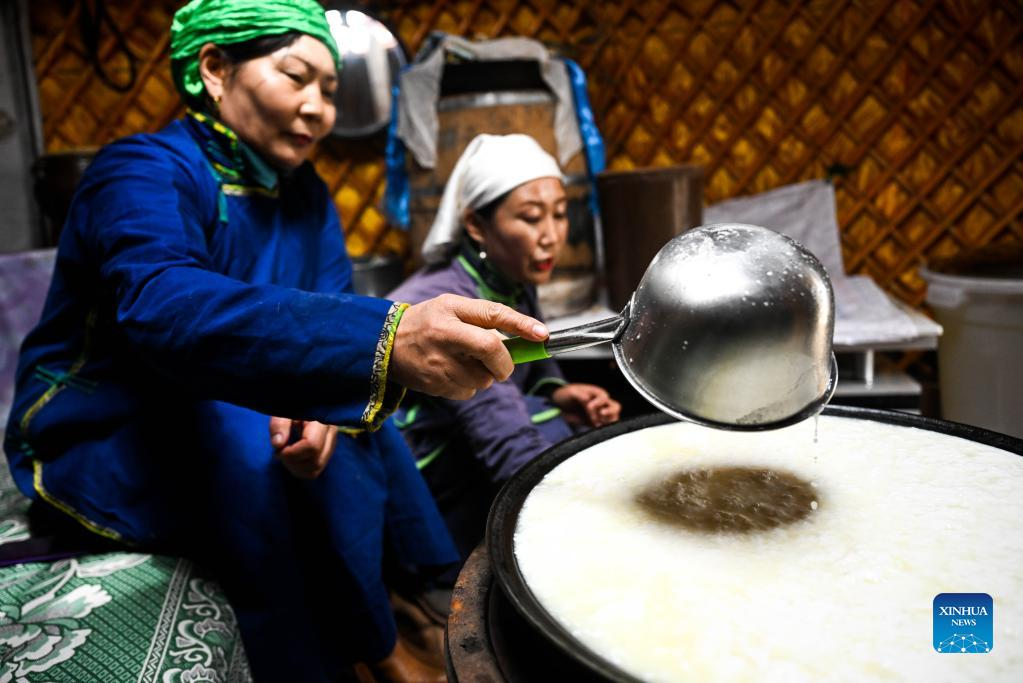 Tao Gao (L) and Altenzagas make dairy product in Zhenglan Banner of Xilingol League, north China's Inner Mongolia Autonomous Region, April 27, 2022. Tao Gao is the national intangible inheritor of Chagaanyidee (dairy product) in Inner Mongolia. She combines modern techniques with traditional crafts and trains herders in pastoral areas to make dairy products. In recent years, the local government has boosted the development of traditional dairy food industry to increase the income of herdsmen. The average annual sales of dairy food in the whole banner reached about 60 million yuan (about 9 million U.S. dollars) in the past two years. (Xinhua/Lian Zhen)