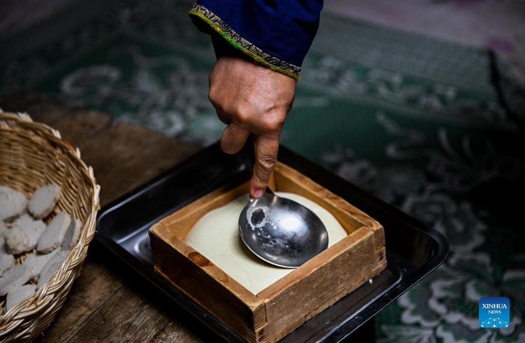 Tao Gao makes dairy product in Zhenglan Banner of Xilingol League, north China's Inner Mongolia Autonomous Region, April 27, 2022. Tao Gao is the national intangible inheritor of Chagaanyidee (dairy product) in Inner Mongolia. She combines modern techniques with traditional crafts and trains herders in pastoral areas to make dairy products. In recent years, the local government has boosted the development of traditional dairy food industry to increase the income of herdsmen. The average annual sales of dairy food in the whole banner reached about 60 million yuan (about 9 million U.S. dollars) in the past two years. (Xinhua/Lian Zhen)