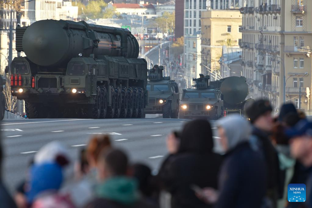 Military vehicles are driven in a rehearsal of the upcoming Victory Day parade in Moscow, Russia, on May 4, 2022. (Photo by Alexander Zemlianichenko Jr/Xinhua)