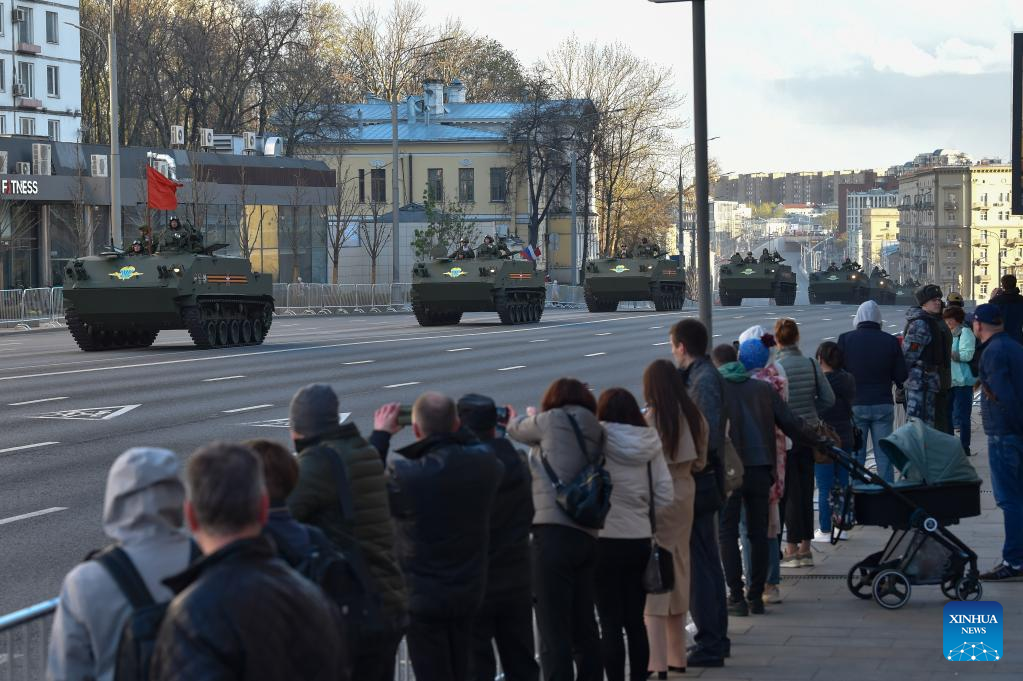 People watch military vehicles driven in a rehearsal of the upcoming Victory Day parade in Moscow, Russia, on May 4, 2022. (Photo by Alexander Zemlianichenko Jr/Xinhua)