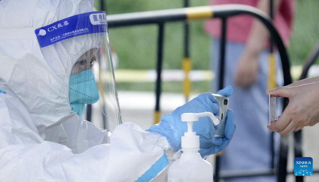 A young volunteer gets residents registered for the nucleic acid tests at a testing site in Chaoyang District of Beijing, capital of China, May 4, 2022. Many young people chose to devote themselves into volunteering work at the front line of the fight against the recent resurgence of COVID-19 in Beijing on Wednesday, China's Youth Day. (Xinhua/Li Xin)