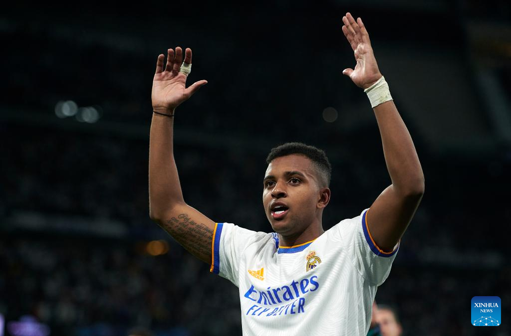 Real Madrid's Rodrygo celebrates the victory after the UEFA Champions League semifinal second leg football match between Real Madrid of Spain and Manchester City of England in Madrid, Spain, May 4, 2022. (Photo by Pablo Morano/Xinhua)