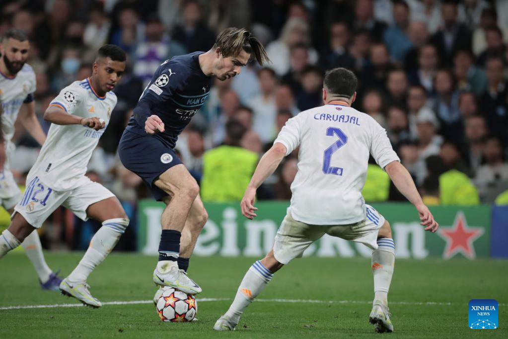 Real Madrid's Dani Carvajal (R) vies with Manchester City's Jack Grealish (2nd R) during the UEFA Champions League semifinal second leg football match between Real Madrid of Spain and Manchester City of England in Madrid, Spain, May 4, 2022. (Xinhua/Meng Dingbo)