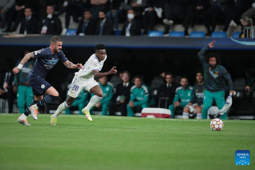 Real Madrid's Vinicius Junior (R) vies with Manchester City's Kyle Walker during the UEFA Champions League semifinal second leg football match between Real Madrid of Spain and Manchester City of England in Madrid, Spain, May 4, 2022. (Xinhua/Meng Dingbo)