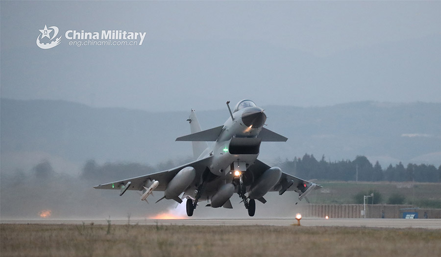 A fighter jet attached to an air force aviation unit under the PLA Southern Theatre Command lifts itself up in an around-the-clock flight training exercise on April 18, 2022. (eng.chinamil.com.cn/Photo by Huang Rongkai)
