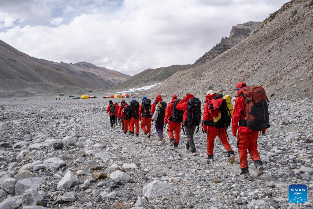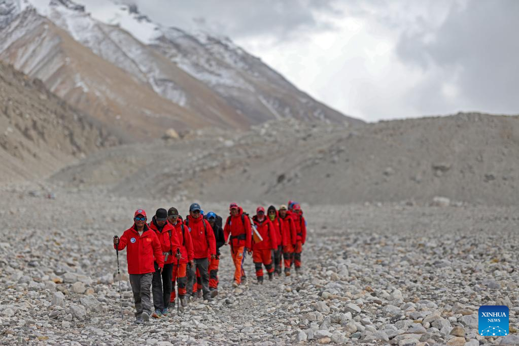 Members of a Chinese scientific expedition team are on the way back to the Mount Qomolangma base camp on May 5, 2022. A Chinese scientific expedition team returned safely to the Mount Qomolangma base camp on Thursday, after reaching the summit of the world's highest peak. All 13 members of the expedition team are in good physical condition. (Xinhua/Sun Fei)
