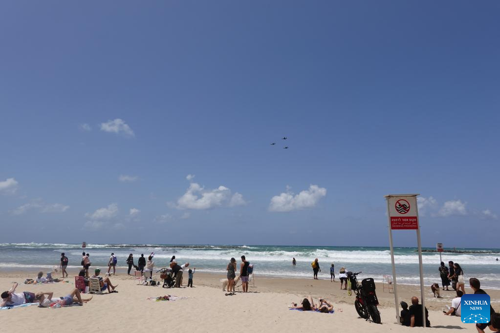 People watch an air show celebrating Israel's 74th Independence Day on a beach in Tel Aviv, Israel, on May 5, 2022. Israelis joined a slew of national celebrations to mark the country's 74th Independence Day. This year's Independent Day began on Wednesday evening and will last till Thursday evening. (Xinhua/Wang Zhuolun)