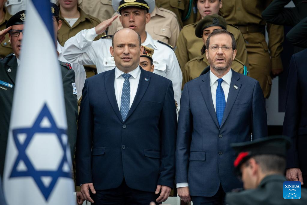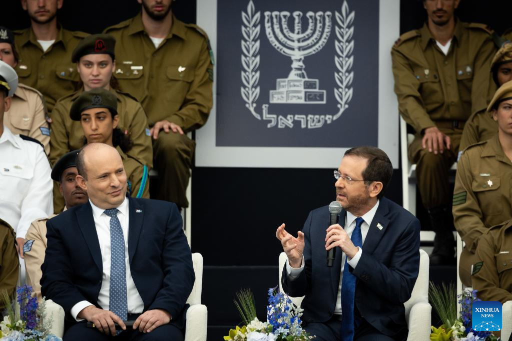 Israeli President Isaac Herzog (R, front) and Prime Minister Naftali Bennett (L, front) attend an event for the distinguished service of soldiers during Israel's 74th Independence Day celebrations in Jerusalem, on May 5, 2022. Israelis joined a slew of national celebrations to mark the country's 74th Independence Day. (JINI via Xinhua)