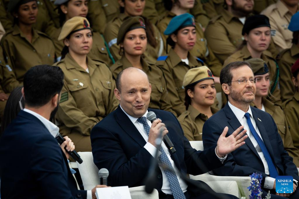 Israeli Prime Minister Naftali Bennett (C, front) speaks at an event for the distinguished service of soldiers during Israel's 74th Independence Day celebrations in Jerusalem, on May 5, 2022. Israelis joined a slew of national celebrations to mark the country's 74th Independence Day. (JINI via Xinhua)
