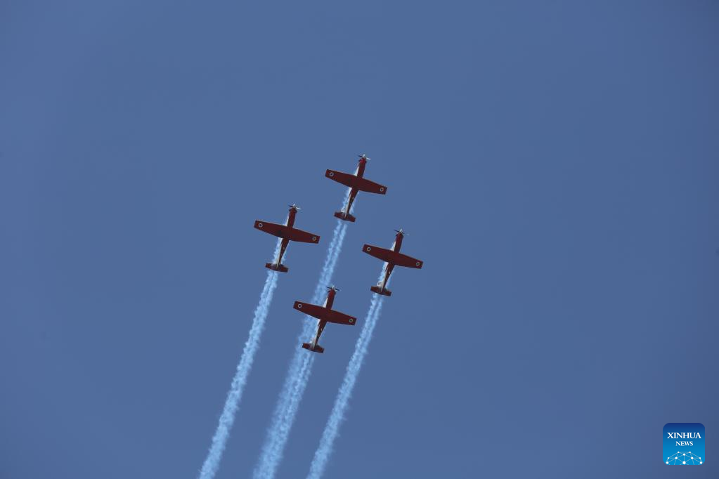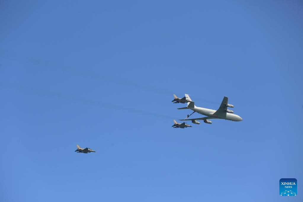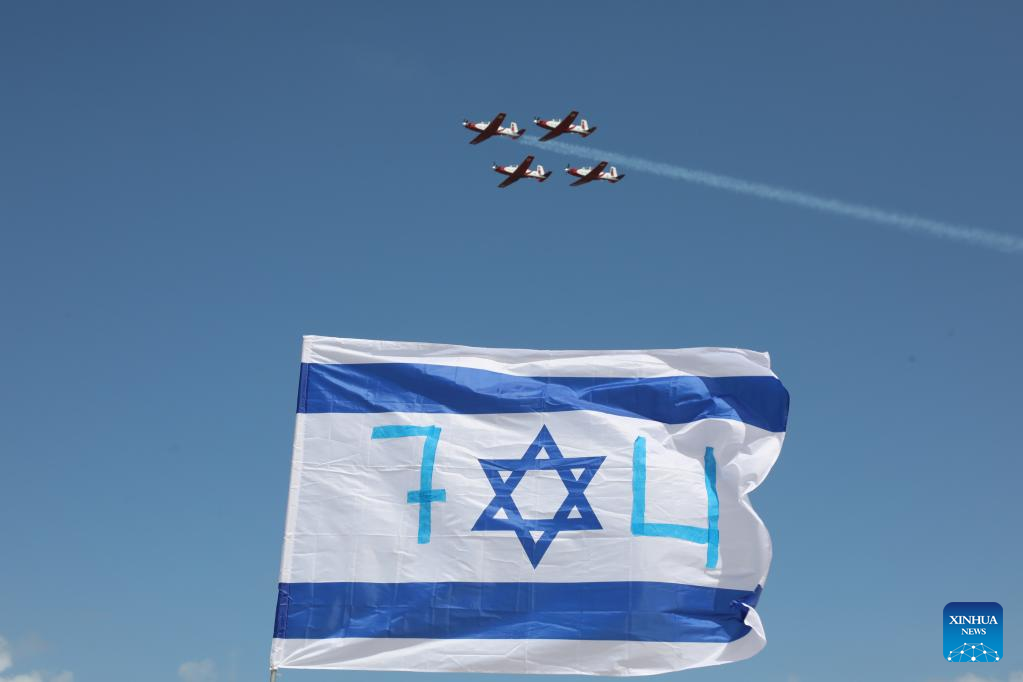 Israeli Air Force aircraft perform during an air show celebrating Israel's 74th Independence Day in Tel Aviv, Israel, on May 5, 2022. Israelis joined a slew of national celebrations to mark the country's 74th Independence Day. This year's Independent Day began on Wednesday evening and will last till Thursday evening. (Xinhua/Shang Hao)