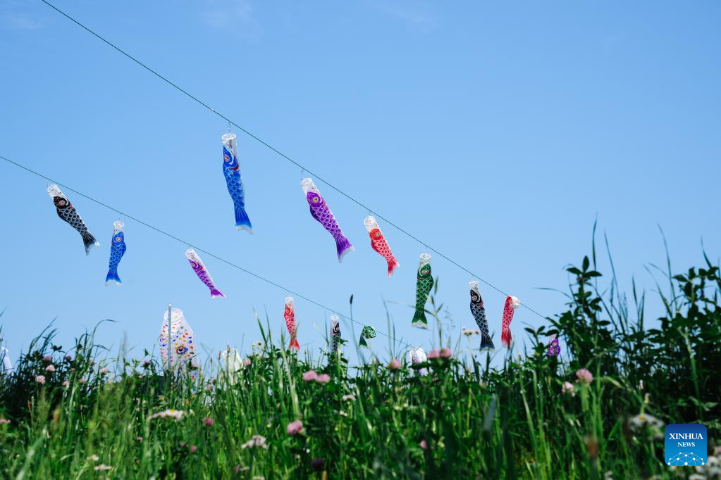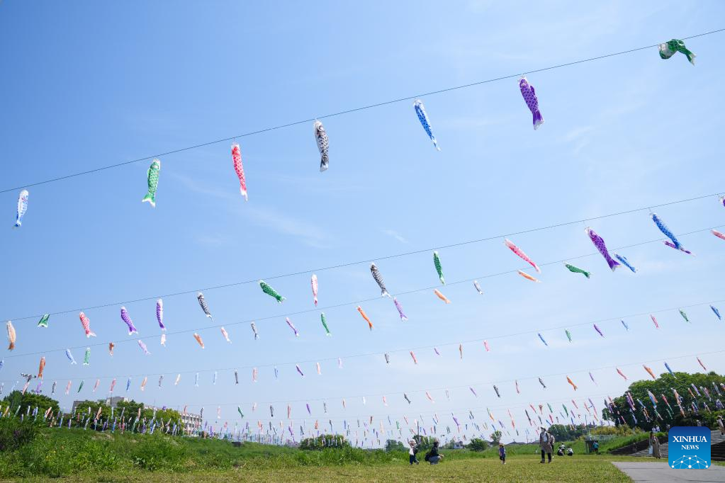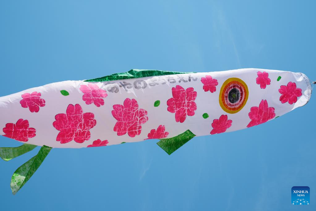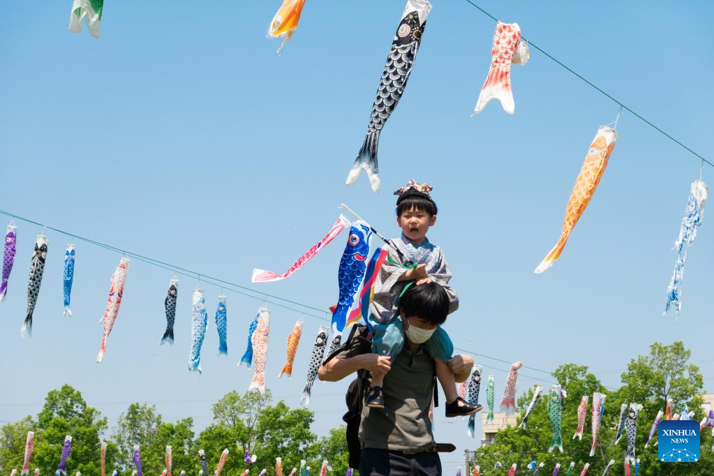 Children view carp streamers, known as koinobori, at the Fudobashi of Koshigaya City, Saitama Prefecture in Japan, May 5, 2022. Japan marks its Children's day on May 5, on which families raise the koinobori to pray for happiness for children. (Xinhua/Zhang Xiaoyu)