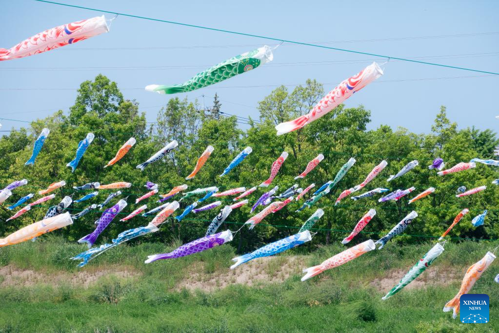 Photo taken on May 5, 2022 shows carp streamers, known as koinobori, at the Fudobashi of Koshigaya City, Saitama Prefecture in Japan. Japan marks its Children's day on May 5, on which families raise the koinobori to pray for happiness for children. (Xinhua/Zhang Xiaoyu)
