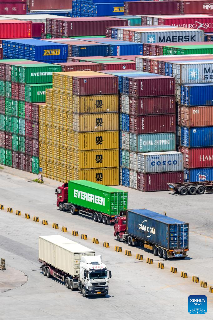 Aerial photo taken on May 6, 2022 shows a view of the Longtan Container Terminal of Nanjing Port in Nanjing, Jiangsu province. Recently, in addition to epidemic prevention and control, Jiangsu Port Group has made efforts in the transportation of people's livelihood materials and important production materials, so as to ensure the safety and stability of the industrial chain and supply chain. (Xinhua/Li Bo)