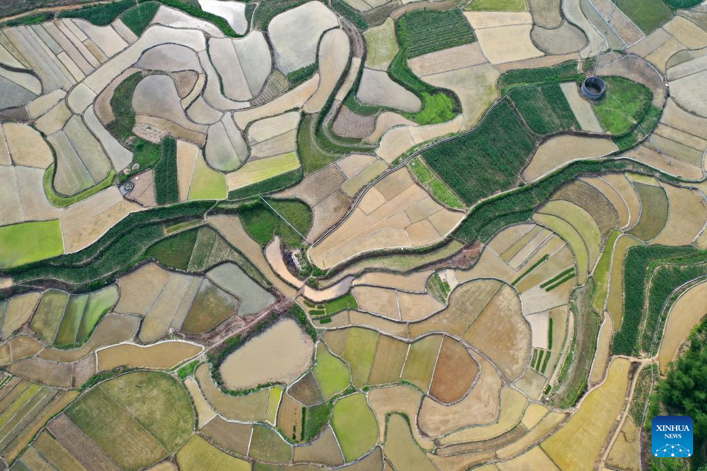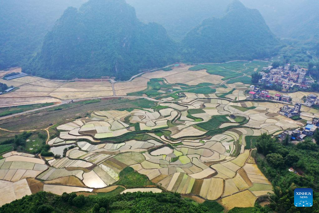 Aerial photo taken on May 6, 2022 shows paddy fields in Donglan County of south China's Guangxi Zhuang Autonomous Region. (Xinhua/Lu Boan)