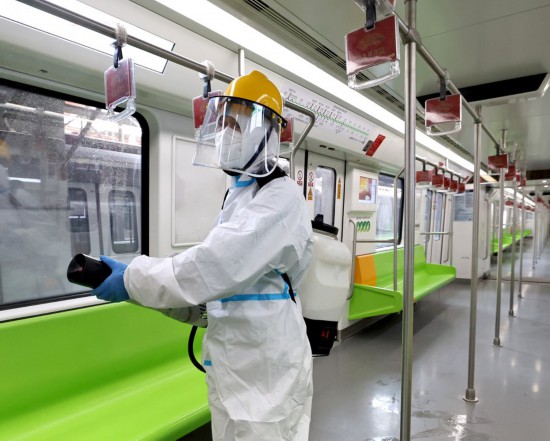 A sanitation worker disinfects subway carriages in east China's Shanghai, May 5, 2022. (Xinhua/Chen Jianli)