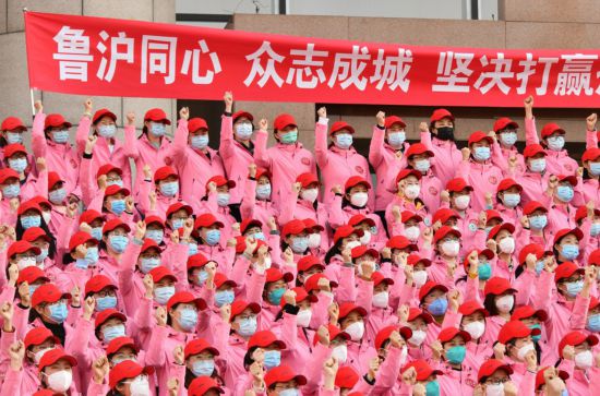 Medical workers from Shandong Province take part in a departure ceremony before leaving for Shanghai, in Jinan, east China's Shandong Province, April 3, 2022. (Xinhua/Xu Suhui)