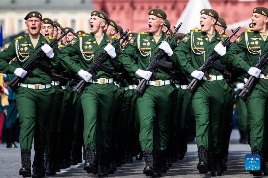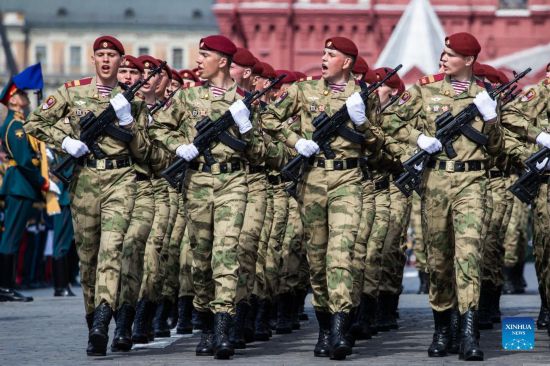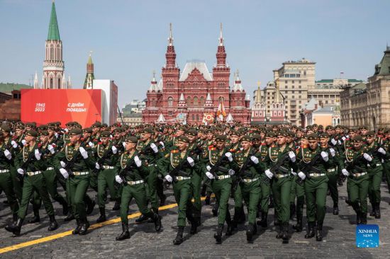 Servicemen march before a rehearsal of the Victory Day parade in Moscow, Russia, May 7, 2022. (Xinhua/Bai Xueqi)