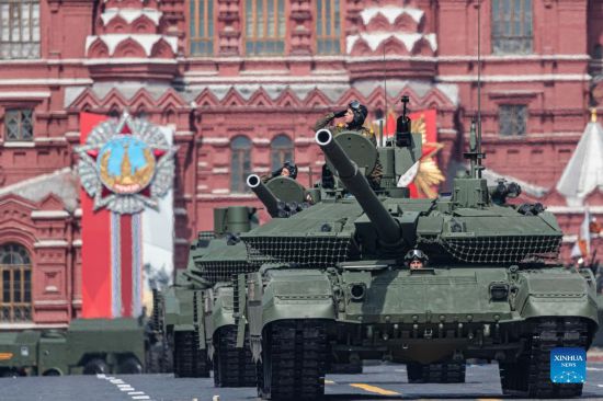 T-90M tanks take part in a rehearsal of the Victory Day parade in Moscow, Russia, May 7, 2022. (Xinhua/Bai Xueqi)