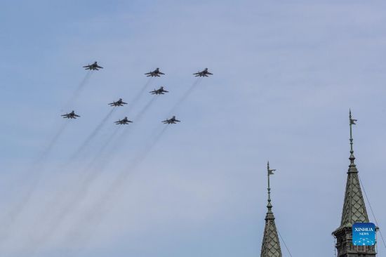 MiG-29SMT fighter jets fly during a rehearsal of the Victory Day parade in Moscow, Russia, May 7, 2022. (Xinhua/Bai Xueqi)