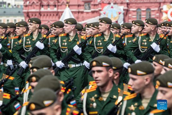 Servicemen take part in a rehearsal of the Victory Day parade in Moscow, Russia, May 7, 2022. (Xinhua/Bai Xueqi)