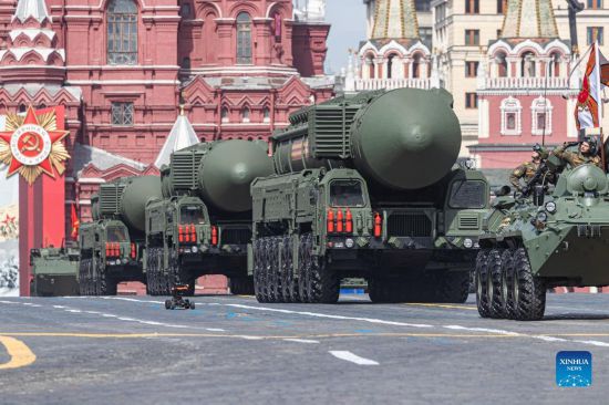 The Yars ballistic missiles take part in a rehearsal of the Victory Day parade in Moscow, Russia, May 7, 2022. (Xinhua/Bai Xueqi)