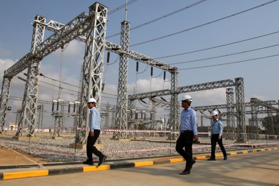 People walk by a China-funded power transmission system in southern Kandal province, Cambodia, April 28, 2016. (Xinhua/Sovannara)