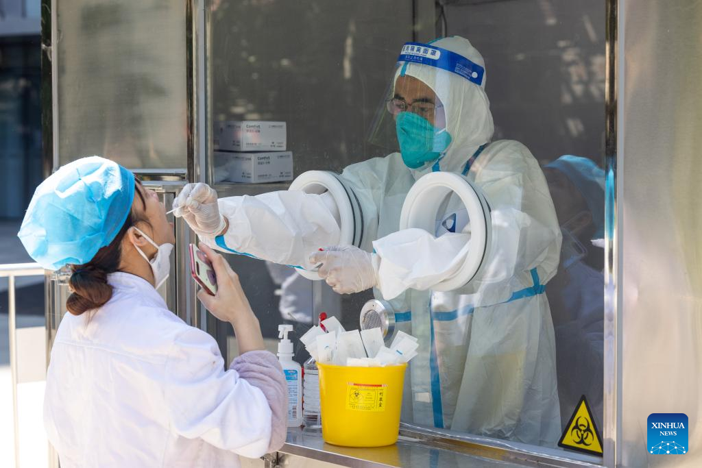 A staff member takes a swab sample from a man for nucleic acid test in Huangpu District, east China's Shanghai, May 8, 2022. Shanghai has set up fixed and mobile acid testing sites in areas such as residential communities, office spaces, business parks and in the vicinities of subway and other public transport stations in accordance with the epidemic situation. (Xinhua/Jin Liwang)