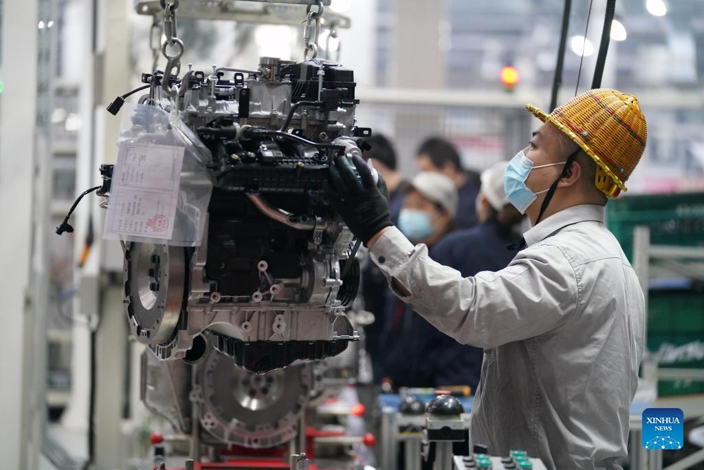 Workers are busy in a workshop of Dongan Auto Engine Co., Ltd. in Harbin, northeast China's Heilongjiang Province, April 15, 2022. The local economy in Heilongjiang continued to recover amid stronger growth momentum in the first quarter. Heilongjiang's value-added industrial output, an important economic indicator, went up 8.1 percent year on year in the first quarter of this year. (Xinhua/Wang Jianwei)