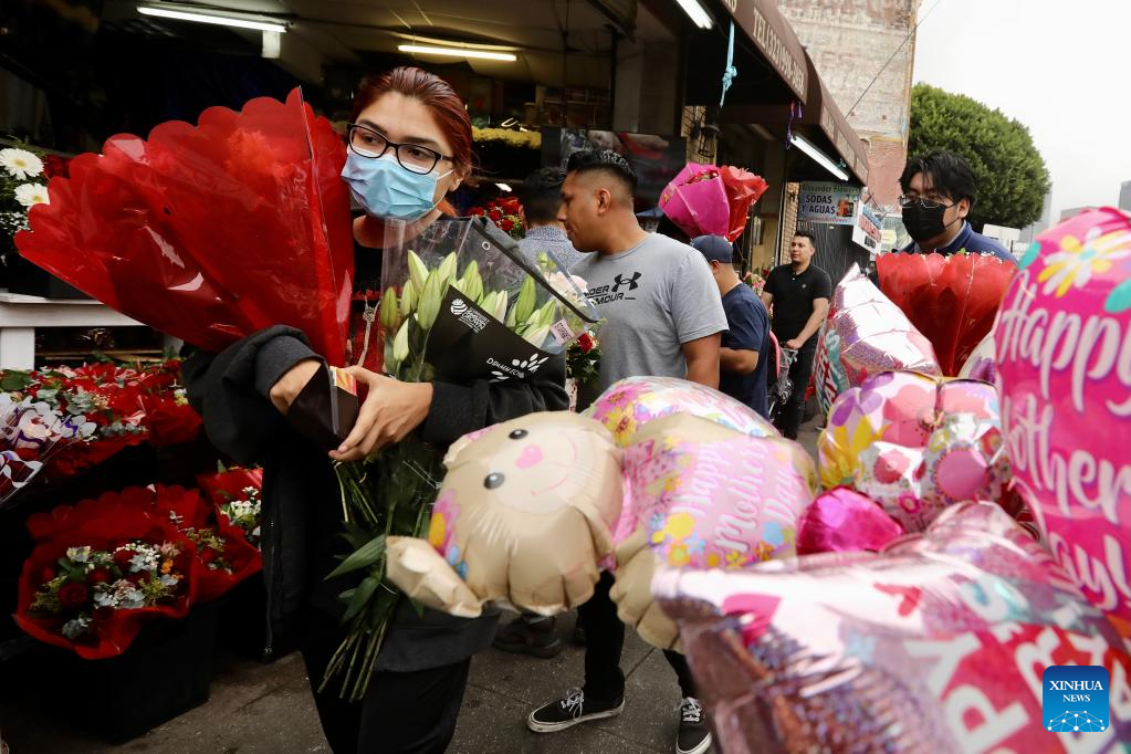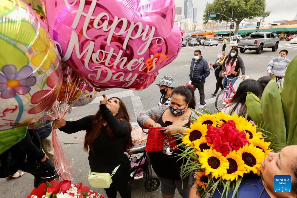 People buy flowers and balloons at a flower market on Mother's Day in downtown Los Angeles, the United States, on May 8, 2022. (Xinhua)