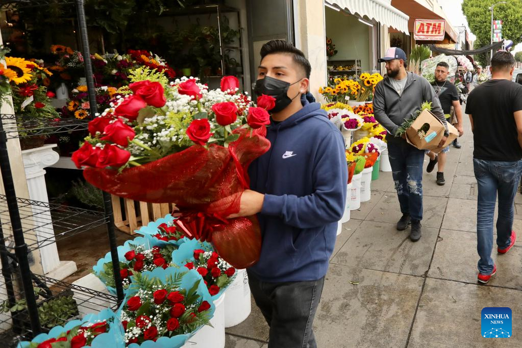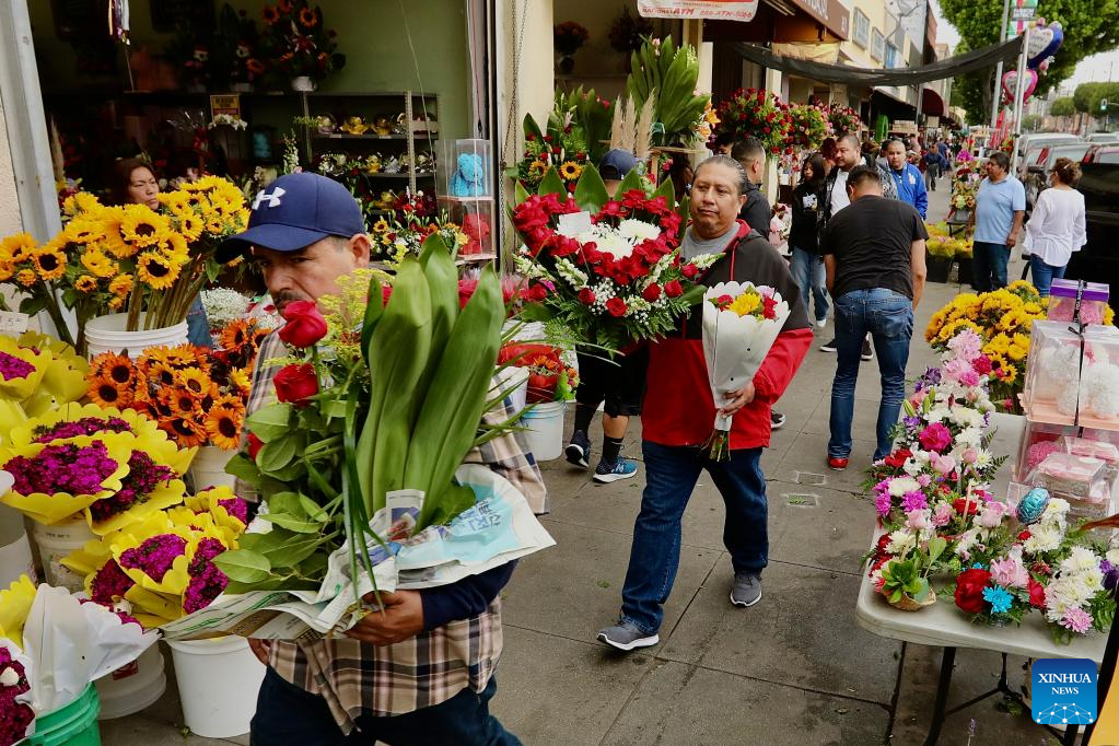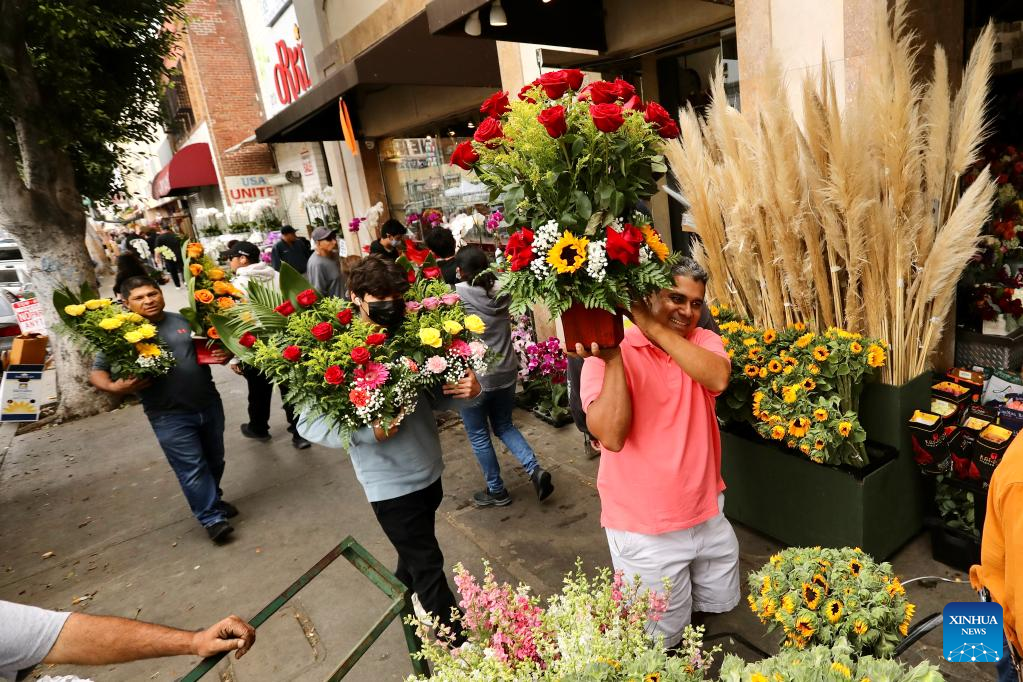 People carrying flowers are seen at a flower market on Mother's Day in downtown Los Angeles, the United States, on May 8, 2022. (Xinhua)