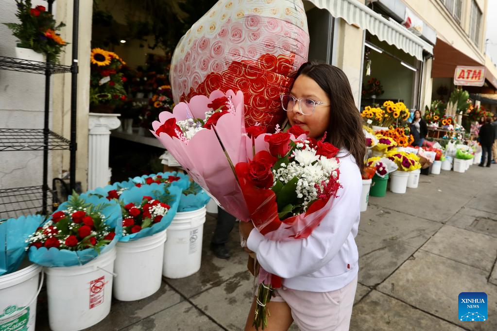 A girl carrying flowers is seen at a flower market on Mother's Day in downtown Los Angeles, the United States, on May 8, 2022. (Xinhua)