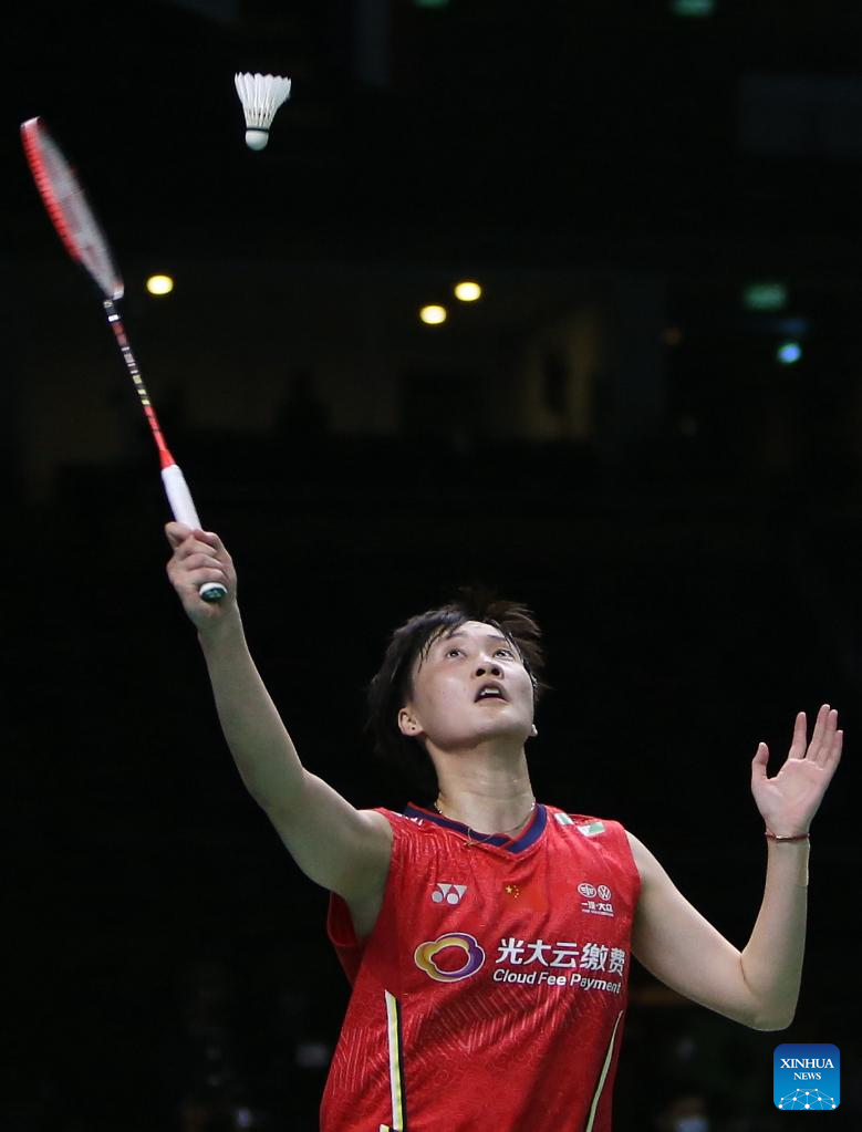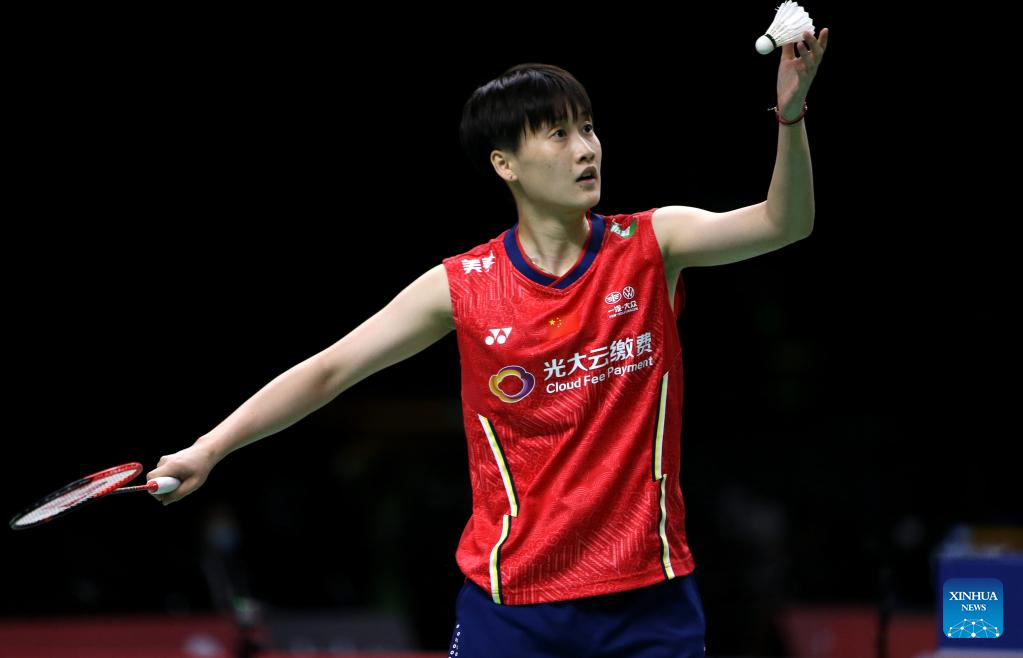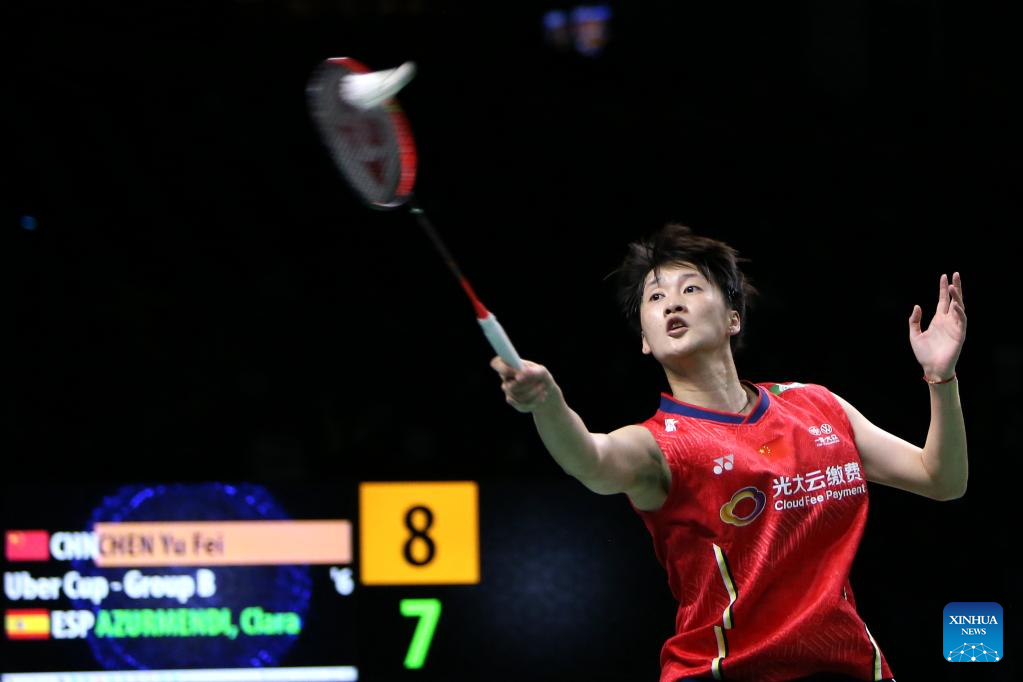 Chen Yufei of China competes against Clara Azurmendi of Spain during the women's singles match of Group B at the Uber Cup badminton tournament in Bangkok, Thailand, May 9, 2022. (Xinhua/Wang Teng)