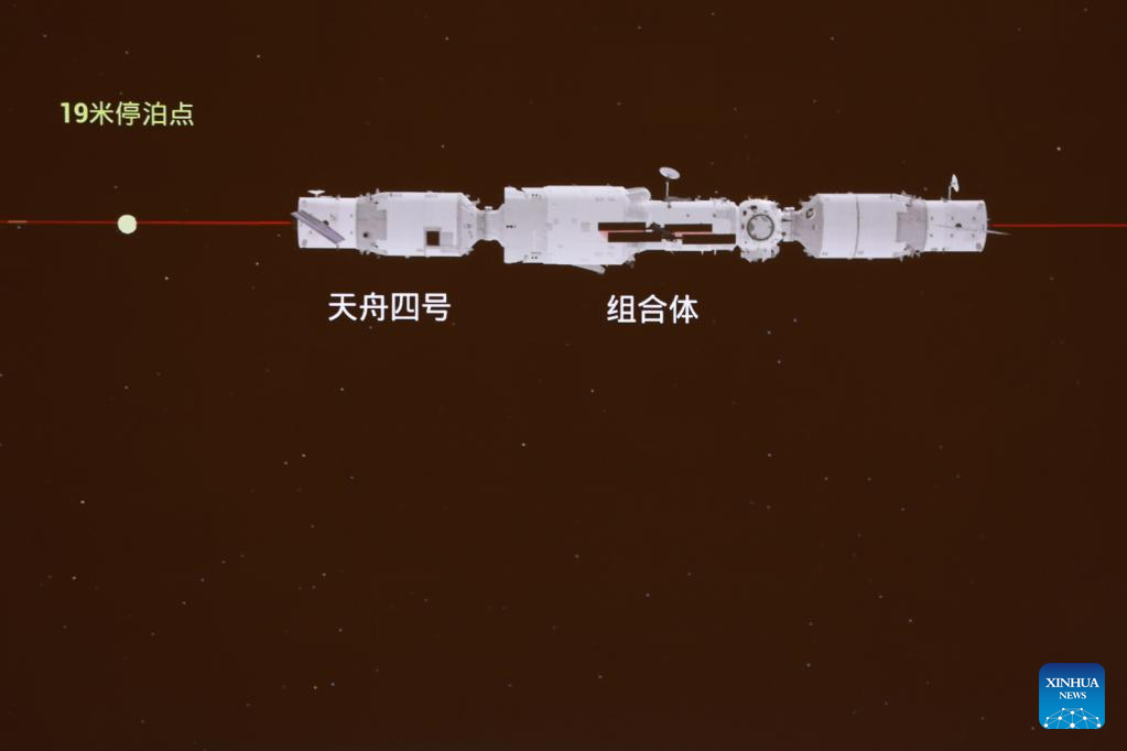 Picture taken at Beijing Aerospace Control Center on May 10, 2022 shows China's cargo spacecraft Tianzhou-4 docking with the combination of the space station core module Tianhe and the Tianzhou-3 cargo craft. China's cargo spacecraft Tianzhou-4, carrying supplies for the upcoming Shenzhou-14 crewed mission, successfully docked with the combination of the space station core module Tianhe and the Tianzhou-3 cargo craft on Tuesday, according to the China Manned Space Agency. (Xinhua/Guo Zhongzheng)