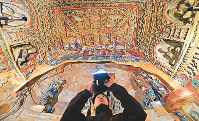 A staff member of the Yungang Grottoes Research Institute collects data in Yungang Grottoes in Datong, Shanxi Province. (Photo/Xinhua)