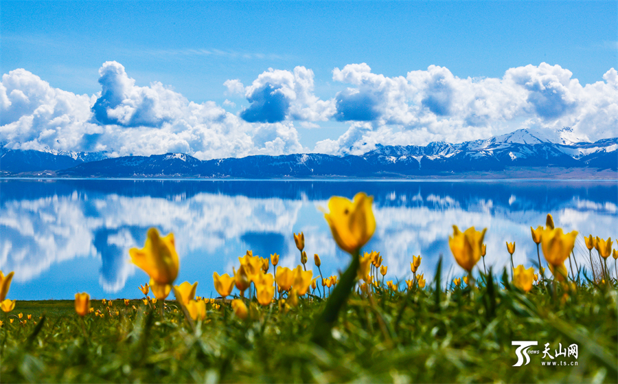 Photo shows wild tulips in full bloom on the shore of the Sayram Lake in northwest China's Xinjiang Uygur Autonomous Region. (Photo/ts.cn)