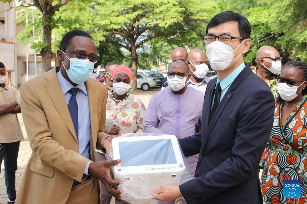 The Charge d'Affaires a.i. of the Chinese Embassy in Benin Yan Yan (R, Front) presents medical equipment to the cabinet director of the Beninese Ministry of Health Petas Akogbeto (L, Front) in Cotonou, Benin, on May 10, 2022. Benin on Tuesday received a batch of Sinovac COVID-19 vaccines as well as medical equipment donated by the Chinese government. (Photo by Seraphin Zounyekpe/Xinhua)