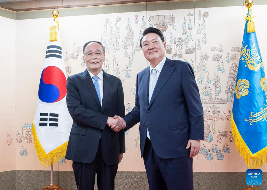 SEOUL, May 10 (Xinhua) -- Visiting Chinese Vice President Wang Qishan and South Korea's newly sworn-in President Yoon Suk-yeol agreed on Tuesday to further bilateral ties and pragmatic cooperation.