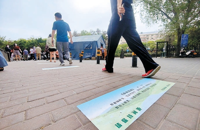 At a nucleic acid testing site in the Jinsongxi neighborhood of Chaoyang district in Beijing, Chinese characters which read “stay strong” and “victory,” accompanied by a variety of interesting pictures, can be seen in areas between the 2-meter marks on the ground and serve the same purpose as reminders.