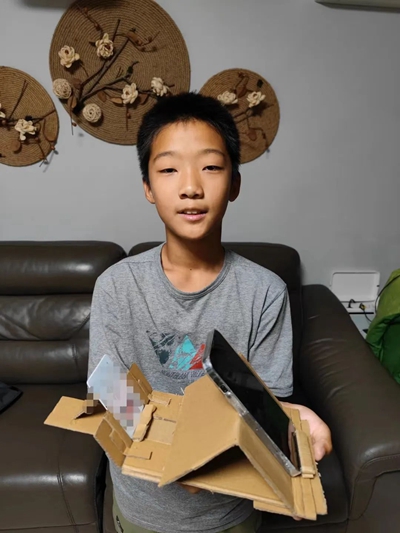 Zhao Ziyue shows the device he built by himself. (Photo courtesy of a residential community in Haidian district of Beijing)