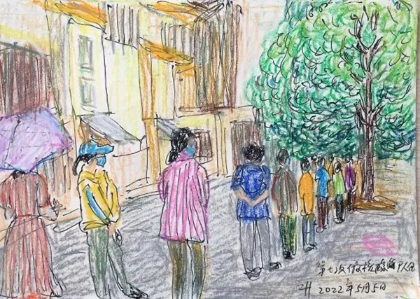 A female resident from a neighborhood in Beijing’s Haidian district drew pictures showing the moments when her neighbors were lined up and waiting for nucleic acid testing while volunteers were meanwhile busy organizing residents to take part in the latest round of testing. The vivid pictures have won praise from local residents.