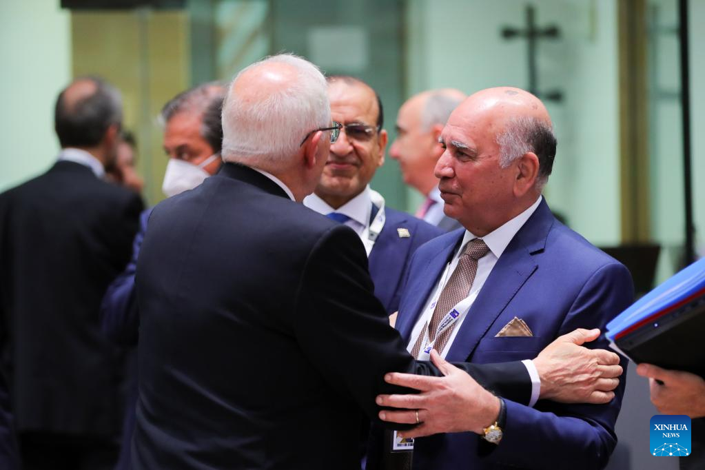 Iraqi Foreign Minister Fuad Hussein (R) attends the sixth European Union's Conference on Supporting the Future of Syria and the Region in Brussels, Belgium, May 10, 2022. (Xinhua/Zheng Huansong)