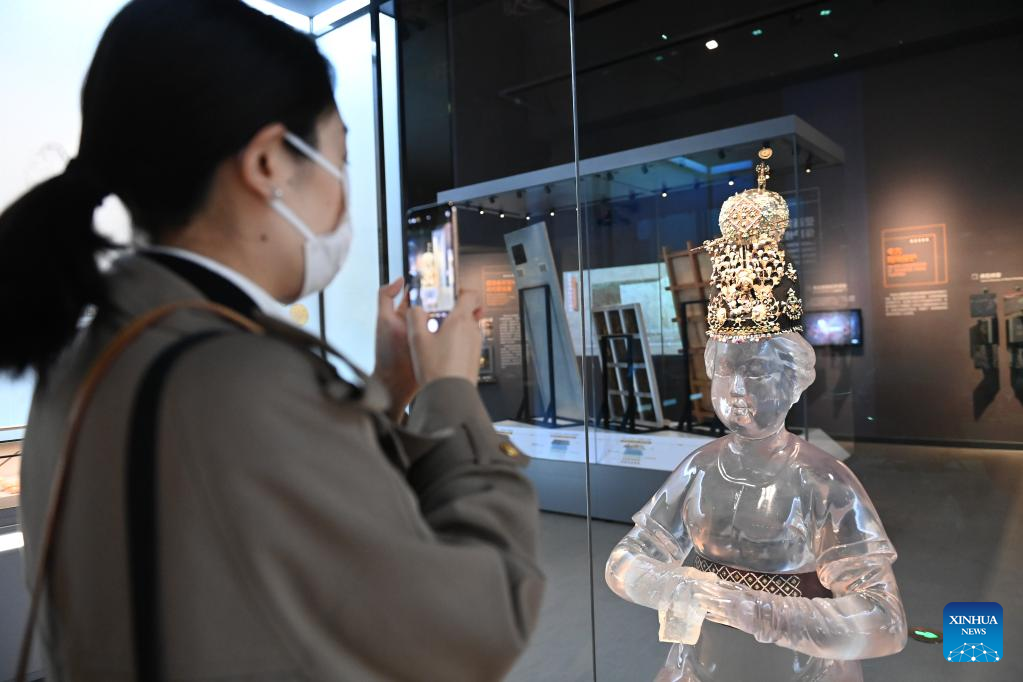 A visitor takes photos of an exhibit at the Shaanxi Archaeology Museum in Xi'an, northwest China's Shaanxi Province, April 28, 2022. (Xinhua/Li Yibo)
