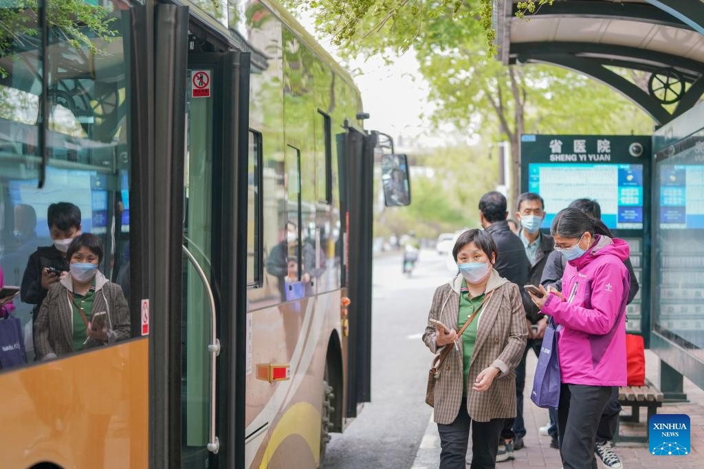 Citizens stand at a bus stop in Harbin, northeast China's Heilongjiang Province, May 11, 2022. Harbin started to resume normal life and production in an orderly manner from Wednesday. (Xinhua/Wang Song)
