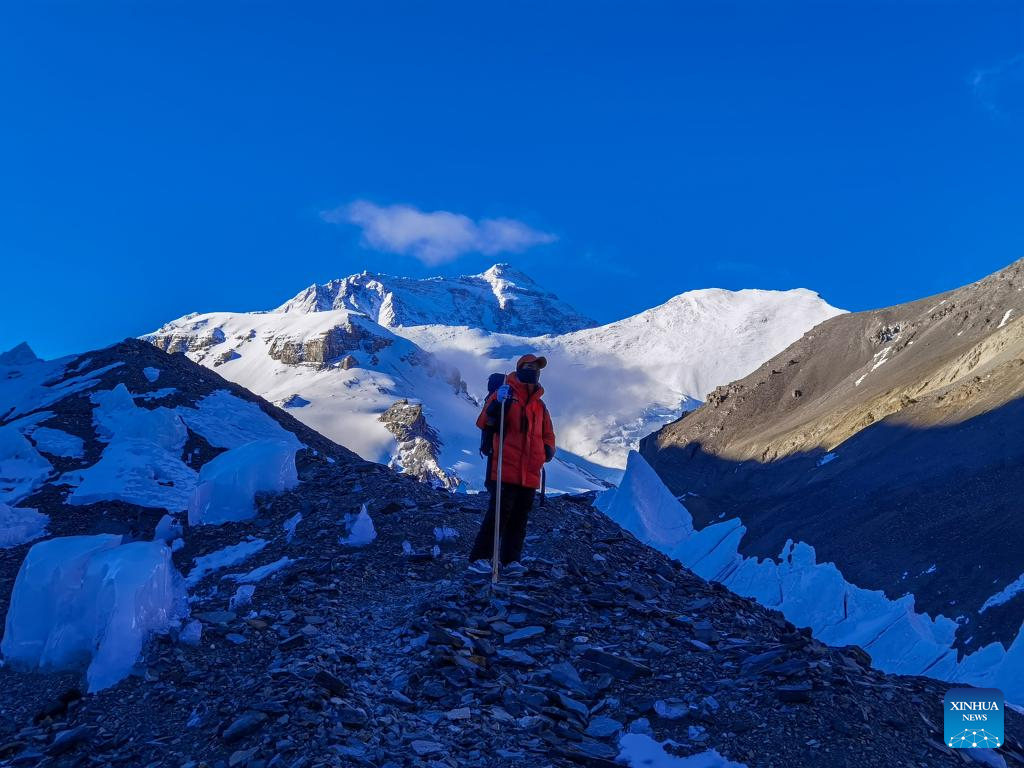 Photo taken with a mobile phone shows a member of the glacier and pollutant research team working at the East Rongbuk glacier on Mount Qomolangma, May 5, 2022. The new comprehensive scientific expedition on Mount Qomolangma, as part of China's second scientific research survey of the Qinghai-Tibet Plateau, is the country's first scientific research above an altitude of 8,000 meters on the peak.