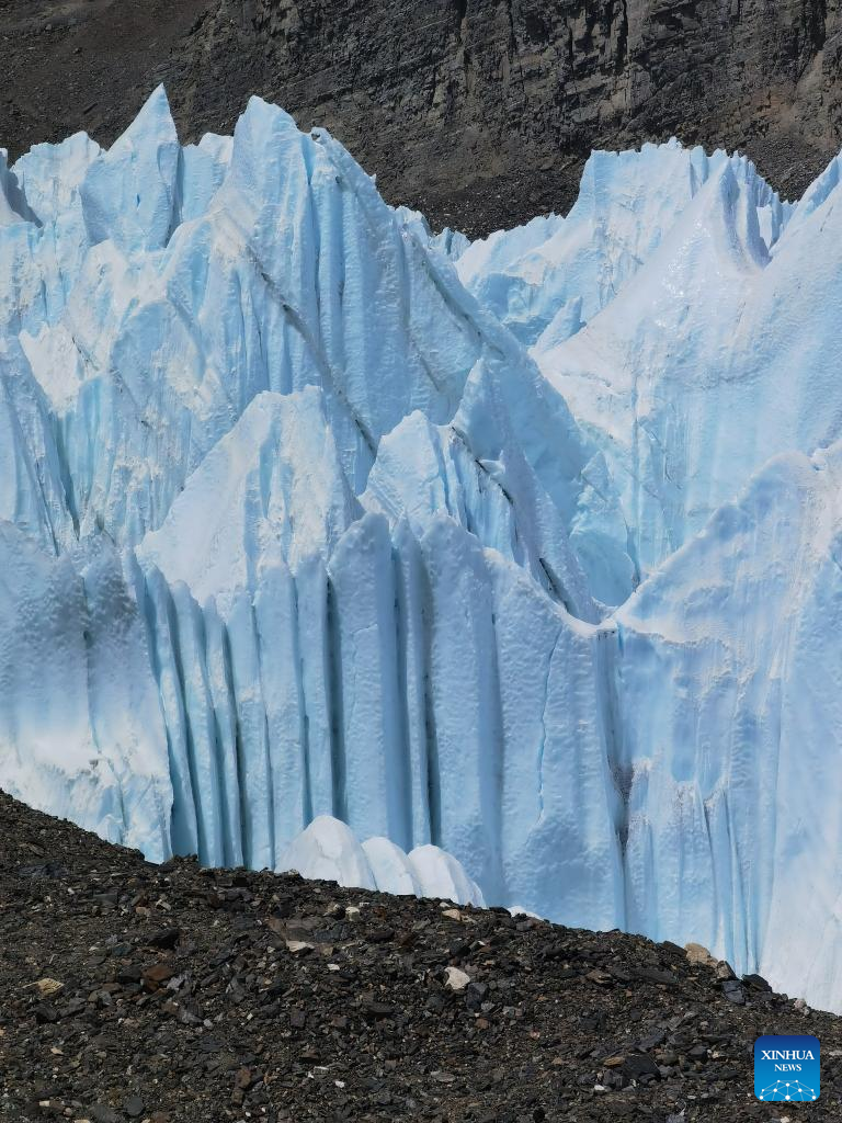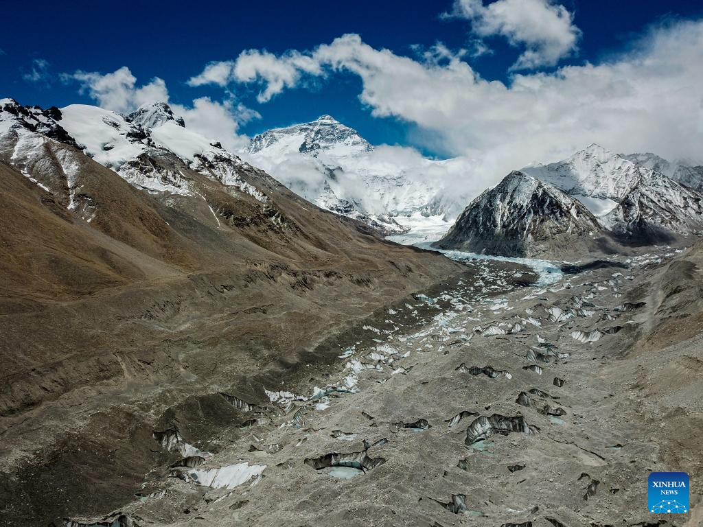 Aerial photo shows a view of the East Rongbuk glacier on Mount Qomolangma, May 8, 2022. The new comprehensive scientific expedition on Mount Qomolangma, as part of China's second scientific research survey of the Qinghai-Tibet Plateau, is the country's first scientific research above an altitude of 8,000 meters on the peak.