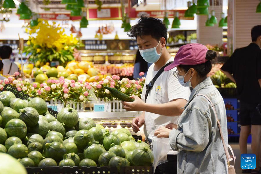 Customers buy vegetables at a supermarket in Mengzi, southwest China's Yunnan Province, May 11, 2022. China's consumer price index (CPI), a main gauge of inflation, rose 2.1 percent year on year in April, the National Bureau of Statistics (NBS) said Wednesday. (Photo by Xue Yingying/Xinhua)