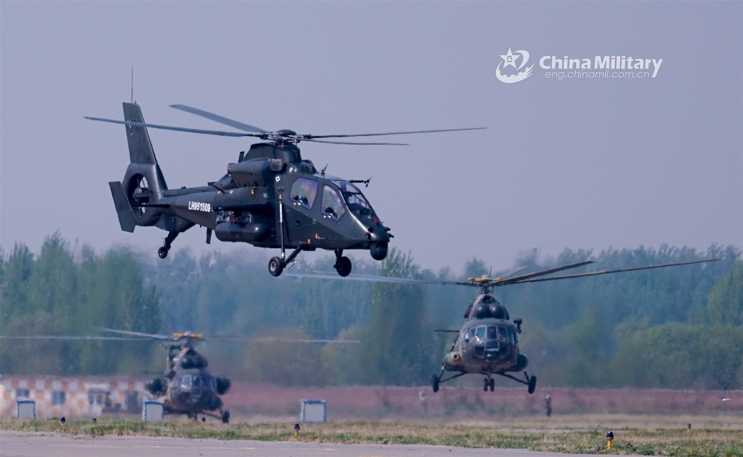Helicopters of different types attached to an aviation brigade under the PLA 81st Group Army fly in formation during a round-the-clock flight training exercise on April 20, 2022. (eng.chinamil.com.cn/Photo by Luan Cheng)